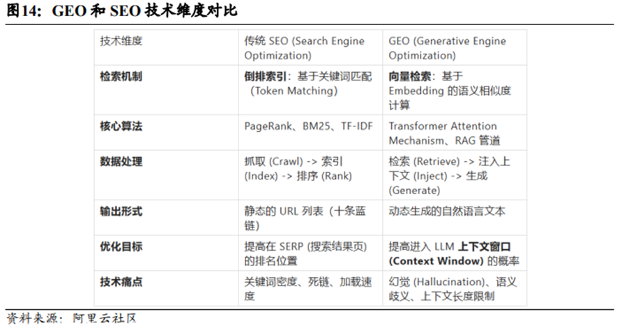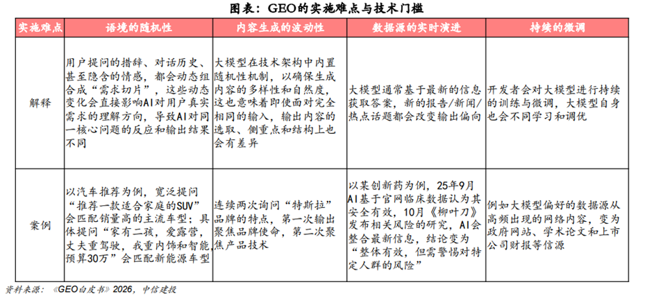 GEO的定制化程度比较高,但大模型的随机性、不透明性以及不同AI搜索产品在生成答案时的差异性均使得GEO的技术门槛更高、进入难度更大,大公司有望在短时间内将大量的项目经验沉淀为行业knowhow,实现强者恒强。