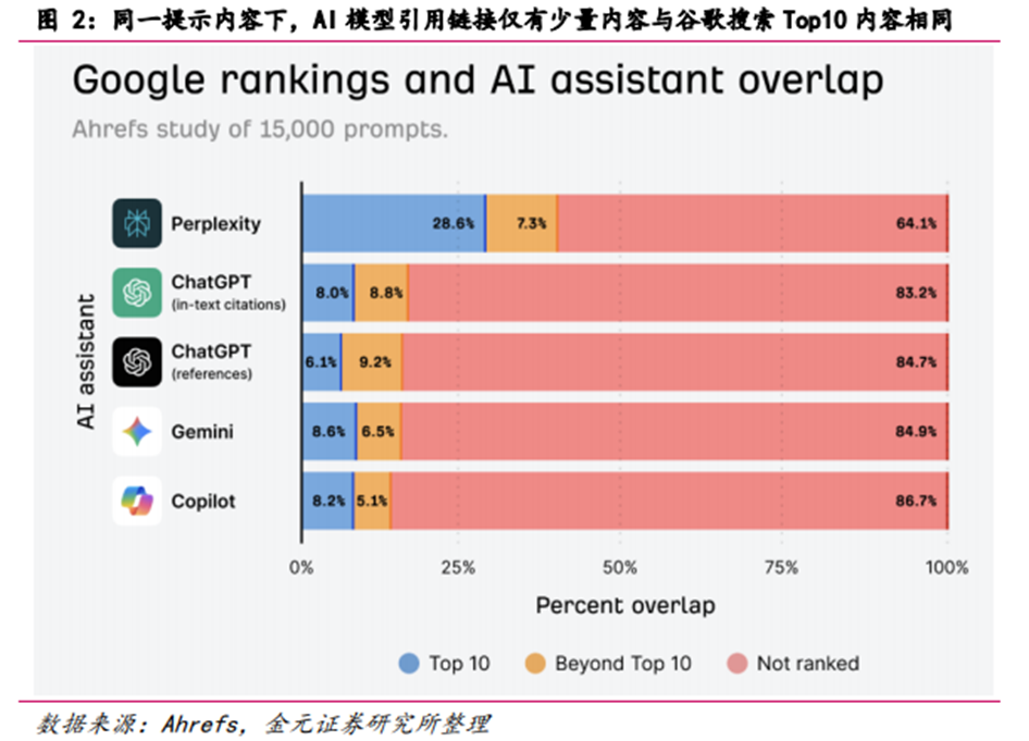 根据Ahrefs研究发现,在一个包含15,000个提示的数据集中,平均只有12%的ChatGPT、Gemini和Copilot引用的链接出现在谷歌搜索同一提示的前十名结果中。