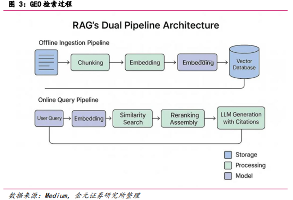目前的AI搜索产品普遍采用RAG(检索增强生成)架构。1)存储。AI存储通过将文本转化为高维向量实现,而非类似传统数据库通过储存文本实现。AI将网页内容分割成多个Chunk(文本块),通过Embedding模型转换成向量,并将这些向量存入向量数据库。2)语义检索。用户提问时,问题也会被转换成向量,系统在向量数据库中计算余弦相似度,召回Top-K个最相关的Chunks。3)上下文注入与生成。召回的Chunks被作为上下文注入到LLM的Prompt中,LLM根据注意力机制判断哪些Chunk信息量更高,更可信。这个过程中,Chunk结构清晰、包括明确的实体(Entity)和数据,更容易被模型引用到最终答案中。