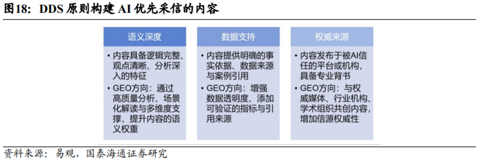 GEO遵循DDS原则。DDS指的是语义深度(Semantic Depth,S)、数据支持(Data Support,S)和权威来源(Authoritative Source,S)。语义深度要求内容逻辑完整、观点清晰、分析深入,从而提升内容在AI理解中的语义权重;数据支持要求内容提供明确的事实依据、数据来源及案例引用,提升可信度;权威来源要求内容发布方具有专业背景及行业公信力,提升内容可信度。
