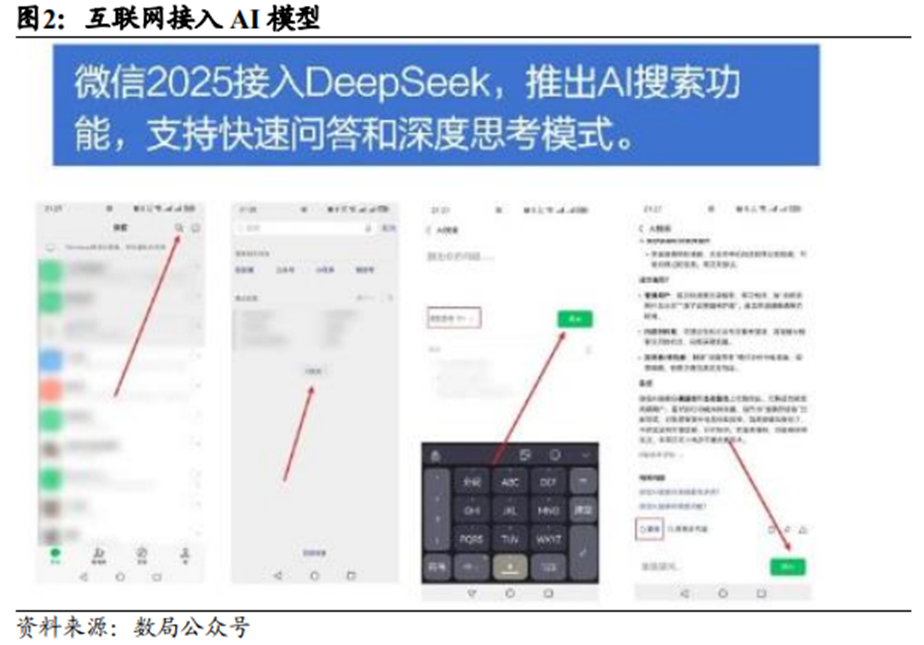 AI正在重塑互联网平台。人工智能已经从工具进化为媒体生态的核心基础设施,字节跳动、百度、阿里、腾讯等巨头正在将AI融入自身的产品建设。比如微信2025年接入DeepSeek,推出AI搜索功能,支持快速问答和深度思考模式;2025年2月微博接入DeepSeek,助力信息查询新体验。