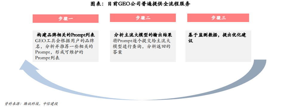 目前GEO公司普遍向客户提供全流程服务,整体过程与GEO优化方法相对应:1)构建品牌相关的Prompt列表(用户可能会使用AI搜索提问的相关问题):GEO工具会根据用户的品牌名,分析并推荐一些相关的Prompt,形成可维护的Prompt列表。2)将Prompt逐个提交给主流大模型进行查询,分析返回的答案:分析的维度主要有两个,一是可见性,包括品牌被提及的次数、位置和官网内容被引用的次数、位置;二是情感倾向,即品牌相关表述是正面还是负面。3)基于监测数据,提出优化建议,持续循环上述“监测-优化”的过程。