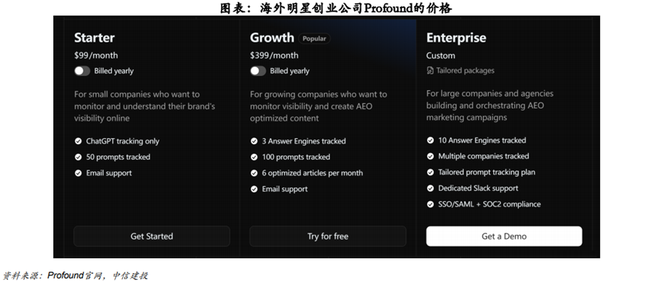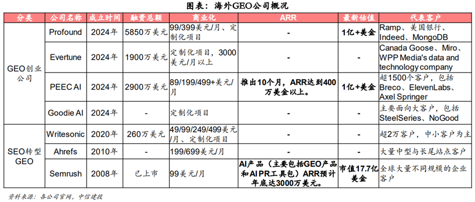 海外GEO公司快速涌现,主要分为两大类:1)原生的GEO创业公司:这些公司普遍在GEO概念诞生的2024年就成立,其中Profound和PEEC AI既面向中小客户提供固定订阅价格的GEO服务,也面向大客户推出定制化业务;Evertune和Goodie AI则聚焦大客户,单月单客户收费在数千美元以上。已有公司估值超过1亿美金。2)增加GEO布局的广告营销公司:例如Ahrefs和Semrush,在SEO时代已积累一定的用户资源和行业know how,通过现有客户增购,提高单客户收入。