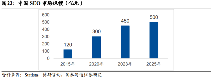 SEO全球市场480亿美元,国内市场500亿元。Statista数据显示,2025年全球SEO市场规模达480亿美元(包括平台、服务等细分领域),预计到2030年增长到千亿美元规模;2025年国内市场规模约500亿美元。