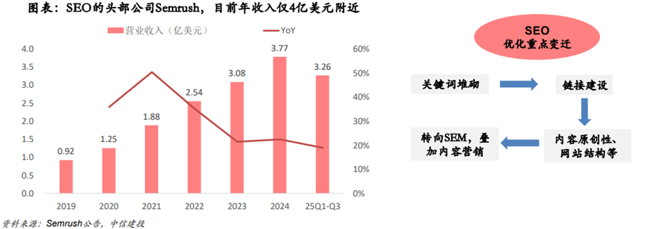 SEO虽已历经接近30年的发展,但竞争格局极度分散,头部公司之一的Semrush收入规模仅4亿美元左右(全球市场规模数百亿美元量级),大量小团队甚至个人覆盖了很多中长尾需求,原因主要是: