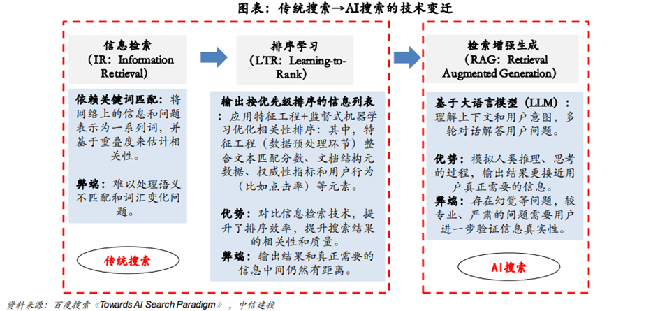 传统搜索引擎基于信息检索、排序学习技术,能系统抓取、索引和检索互联网信息,并多维度进行排序,回答用户的查询。