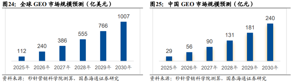 全球GEO市场破百亿美元,国内GEO市场近30亿元。在流量入口转移的趋势下,GEO市场迎来快速发展。艾瑞咨询数据显示,2025Q2中国GEO市场规模同比增长超200%,超过78%的企业决策者将AI搜索优化列为数字化转型优先级。市场研究机构Garter预测2026年传统搜索引擎流量将下滑25%,AI聊天机器人及其他虚拟优化方式将进一步抢占搜索引擎市场份额,预计2028年50%搜索引擎流量将被AI搜索蚕食。据秒针营销科学院,2025年全球GEO市场规模112亿美元,中国GEO市场规模29亿元。预计2030年全球市场规模破千亿美元,中国市场规模达240亿元。