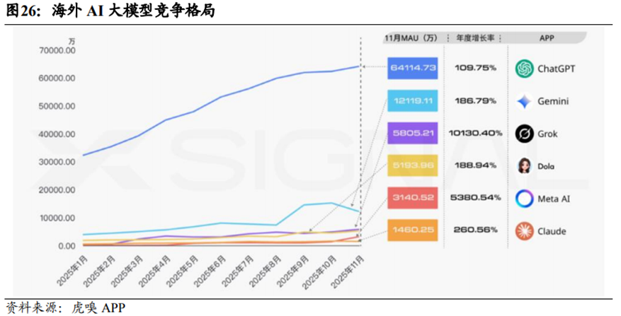 海外大模型维持一超多强格局。截至2025年11月,全球大模型用户前三的产品分别是ChatGPT、Gemini、Grok,用户数分别为6.4亿人、1.2亿人、0.58亿人,同比增长率分别为109.75%、186.79%、10130.4%。其中ChatGPT规模遥遥领先,在通用对话赛道,已经成功实现了用户习惯的基础设施化。