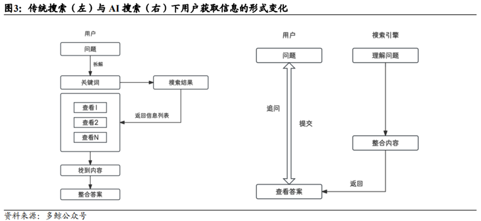 传统搜索引擎的核心是信息优化、匹配,AI搜索是基于大模型进行思考、给出答案。二者的核心均是信息匹配,但实现路径不同。