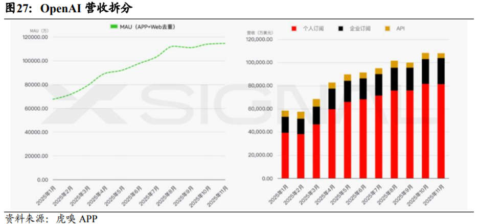 商业模式由订阅 API调用向生态转型。海外大模型商业模式以个人订阅、企业订阅、API为主,以龙头OpenAI为例,23年到25年底公司经历了爆发增长,用户数由23年12月的3.23亿MAU快速提升至25年11月的11.44亿MAU,增长超3.5倍;商业化方面,月营收增长近5倍达25年11月的10.8亿元,主要由个人订阅增长所驱动。个人订阅业务营收由23年底的1.03亿元增长至2025年11月的8.13亿元,营收占比由46.54%提升至75.23%。企业订阅则保持稳健增长,API绝对值有所波动。
