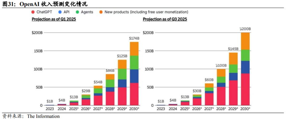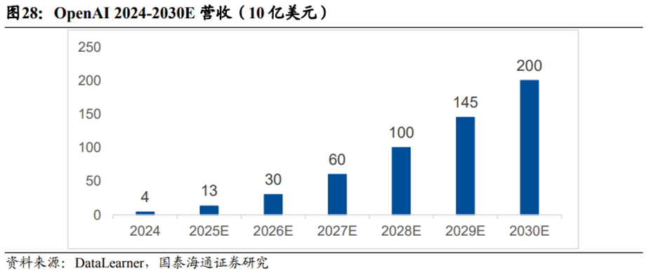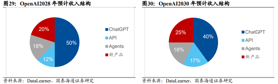 Agent、新产品成为营收新增长极。据OpenAI预测,公司2025、2028、2030年营收将达到130、1000、2000亿美元,2024-2030年复合增速近92%。结构上,收入来源将由ChatGPT订阅与API扩展至Agent与“新产品(含免费用户变现)”。其中新产品指的是结合ACP(Agentic Commerce Protocol)实现对话即交易,用户在对话框直接完成购买,而无需跳转第三方APP,其中OpenAI可进一步从GMV中进行抽佣,也可通过AI搜索实现广告收入,对免费用户实现流量变现。2025年预计ChatGPT、Agents、API分别贡献100、20、10亿美元收入;2028年预计ChatGPT、Agents、API、新业务分别占比50%、18%、12%、20%;2030年预计ChatGPT、Agents、API、新业务分别占比40%、18%、17%、25%。