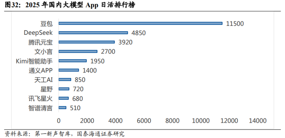 国内大模型一超两强格局。目前国内大模型已形成互联网巨头和AI独角兽主导的竞争格局,头部产品豆包、DeepSeek、元宝日活分别为1.15亿、0.49亿、0.39亿。