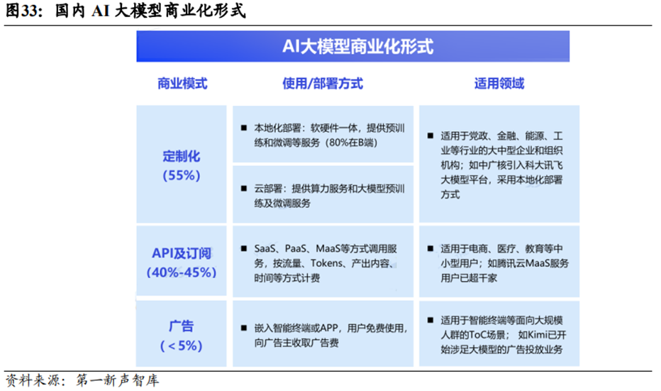 商业模式来看,国内大模型主要通过定制化,API和订阅变现,广告目前占比较低。1)定制化模式主要面向大型政企,采用定制化本地部署模式,企业需要定期迭代更新。主要通过收取一次性的部署费用,以及后续的更新维护费用变现。2)API和订阅主要面向中小企业及机构,该模式具有节省资源、快速集成、实时更新和可扩展性强等优势。API主要按token收费,订阅则通过向个人用户收取月费提供更高级功能变现。3)广告模式逐渐落地。随着大模型应用的普及,将大模型嵌入人工智能终端和APP中,向广告主收取广告费的模式也将成为大模型变现的重要方式,此外GEO等营销新模式也开始兴起。