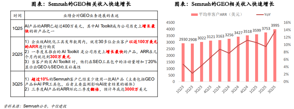 Semrush的GEO产品快速商业化,推动单客户ARR提速增长。从GEO产品自身的商业化进展看,三季度AI产品(主要包括GEO产品和AIPR工具包,后者主要监测影响AI搜索结果的媒体)的ARR环比二季度翻倍,预计年底达3000万美元,占整体ARR的比例达7%。预计GEO产品贡献主要增量。从公司整体财务表现看,三季度平均单客户ARR达3995美元,同比增长14%,增速创23年以来新高,预计一方面是公司持续拓展大客户,另一方面是GEO产品吸引现有客户增购,目前超过10%的Semrush客户已经至少使用一款AI产品。