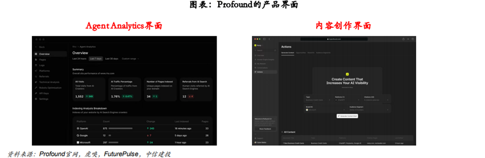 Profound以SaaS软件的形式向用户提供服务,功能覆盖数据监测与优化。主要包括1)AnswerEngine Insights:实时展示各大主流AI搜索引擎对客户所在行业、产品和竞品的描述;2)Agent Analytics:识别和分析AI平台如何对客户网站进行访问和信息抓取;3)Conversation Explorer:梳理与客户相关的Prompt和问答需求;4)内容创作计划:包含建议的主题、标题结构、需引用的事实数据等;5)AEO内容创作模板:基于数据分析结果进行内容创作与发布(如博客文章、对比指南等)。