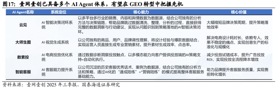 头部代运营公司对媒介、渠道变化反应敏锐,且具备AI系统能力,有望在SEO向GEO转变过程中把握先发优势,如头部代运营商壹网壹创,此前已与阿里有AIagent深度合作,有望在GEO转型中把握先机。