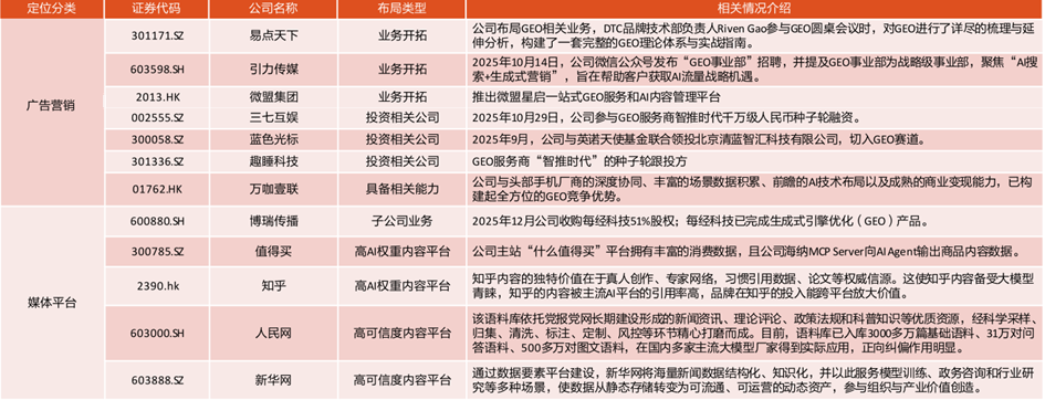 2025年11月中旬,公司与合作伙伴发布了GEO相关的解决方案,所提供的产品及服务依托深厚的数智化能力与对AI生态的深度洞察及长期服务500强及行业头部品牌的场景积累,形成了一套覆盖“监测-分析-生成-分发-迭代”的全链条GEO解决方案,全面覆盖国内外主流AI平台,包括ChatGPT、豆包、Gemini、腾讯元宝、Perplexity、DeepSeek、Kimi等,提供本地化运营支持,助力品牌在AI时代构建可持续的推荐优势,为企业提供从策略到落地的全栈式AI搜索优化解决方案,满足客户AI大模型时代品牌营销的需求。目前该解决方案已在快消品、教育、汽车等行业进行推进。