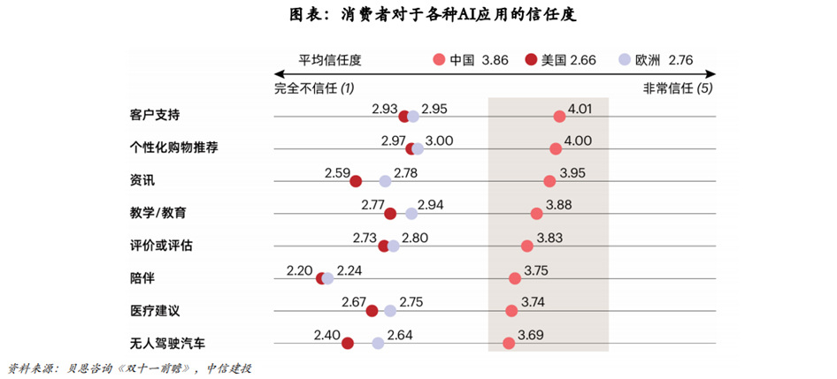 用户大范围将AI应用于购物消费的背后,是对AI的信任度持续提升。根据贝恩咨询的调研,个性化购物推荐是消费者信任度最高的AI应用领域,其中中国消费者的信任度分别较美国和欧洲高35%和33%。随着消费者对AI的信任度增加、AI对购物决策的影响力提升,通过GEO的方式增加相关内容在AI答案中的可见度,变得至关重要。