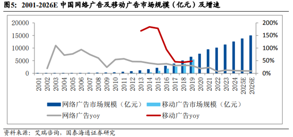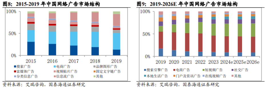 营销预算随流量转移。广告的核心是触达更多受众,随着流量入口迁移,营销预算也随之迁移至新入口。2015年之前的PC互联网时代,搜索引擎广告是占比最大的广告类型。2016年之后的移动互联网时代,随着流量入口迁移至手机App,移动广告市场保持高增,在此过程中,信息流/短视频广告份额快速提升,搜索引擎广告份额持续下降。