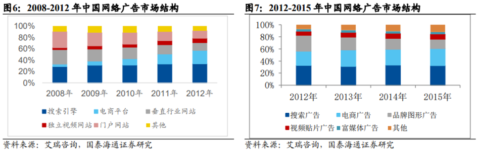 PC互联网时代(2000-2015年):2015年之前,流量高度集中于搜索引擎和门户网站,该时期网络广告规模由2008年的170亿元增长至2015年的2093.7亿元,其中搜索广告是占比最大的广告类型,份额由28.6%增长至32.6%。百度在搜索广告市场份额占第一,2015年百度在中国搜索引擎市场市占率80.8%。