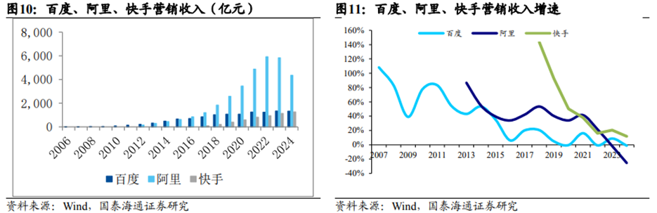 以百度、阿里、快手为例,分别观察搜索引擎广告、电商广告、短视频广告增长情况。2015年之前百度每年营收增长保持在35%以上,2015年之后增速下滑;阿里电商增速拐点出现在2023年,此前保持高速增长;快手广告业务在2022年以来每年仍保持15%以上的增速。