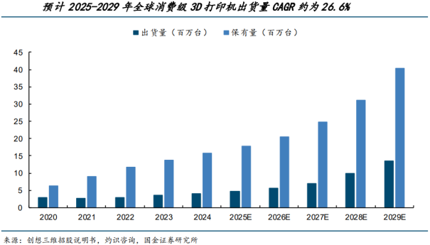 消费级市场的扩张,源于技术普惠与人性深层需求的碰撞,其增长逻辑已从“拥有一台打印机”转变为“创造万物的需求”。价格平民化:主流消费级FDM设备价格已从数年前的上万元下探至2000-3000元区间,零售价格进入大众电子消费品的价格带。速度与可靠性飞跃:以拓竹科技为代表的品牌,将打印速度大幅提升,并通过自动调平、堵塞检测、多色打印等功能,将打印成功率大幅提高。生态闭环简化:如MakerWorld(拓竹生态)等社区平台提供海量“一键打印”模型,用户无需掌握复杂的三维建模技能,即可轻松实现从创意到实物的转化。技术门槛的消失,是市场扩大的先决条件。(2)AI技术大幅降低创作与使用门槛,人造万物需求不断放大消费级3D打印的下游应用呈现高度发散和长尾特征,其核心驱动力是创造与个性化满足需求被充分激活。3D打印将生产工具交到每个人手中,激发了传统供应链无法满足的、海量的、碎片化的创造性需求。随着AI生成式3D模型的成熟,这一创造需求还将被进一步放大。个性化消费:打印独一无二的潮玩手办、家居装饰、个性化配件(手机壳、键帽),满足情感与审美价值。实用工具DIY:修复损坏的家居零件、制作特定工具(如自行车配件、园艺工具)、为宠物定制用品。在北美,车库创客文化深厚,3D打印已成为家庭工具箱的标准配置。教育与实践:成为教育的重要载体,将抽象概念具象化;同时也是设计师、工程师验证创意的低成本工具。另一方面,AI应用持续落地也大幅降低创作门槛,助力消费级3D打印快速普及。根据北京青年报,一般而言使用3D打印需要通过专业建模软件,掌握一定的建模知识,才能设计出自己想要的产品;或者可以通过爱好者网站分享的建模数据进行打印,但是可打印的产品款式有局限性,但AI技术的推广大大降低了3D打印机的使用门槛。根据中国日报25年8月报道,中国科技企业数美万物正式发布全球首款面向三维创作的高清模型生成工具——Hitem3D。这款产品通过上传一张图片,即可一键生成分辨率高达1536^3的高清三维模型,支持直接应用于工业设计、3D打印、数字孪生等多场景。Hitem3D背后采用数美万物自主研发的Sparc3D算法。不同于传统三维模型算法需先将数据压缩到二维,再重建为三维导致细节损失,Sparc3D基于稀疏卷积网络和3D变分自编码器(VAE)技术,实现三维数据输入与输出几乎无损。该方案将重建误差降低40%,而数美最新发布的Ultra 3D方案中,将让这个高速的3D生成框架提速6.7倍,大幅减少运算量,同时保留微观结构。在全球同类产品大多仅能生成1024^3分辨率模型时,Hitem3D实现1536^3分辨率雕刻级建模,首次让AI生成模型达到工业生产级别的细腻程度。根据中国日报网报道,北京的一家原创潮玩设计工作室负责人告诉记者,过去他们设计一个新形象的三维模型,需要团队建模师手动完成,复杂模型通常要耗时4-5天。很多创意因为建模时间长,生产排期就往后拖,有时想法还没打样出来就被市场替代。现在使用Hitem3D后,仅需上传一张概念图,几分钟内即可获得高清三维模型,直接对接3D打印或打样厂商。因此随着3D打印设备价格的降低以及AI建模软件的持续升级,消费级3D打印无论在硬件端和软件端均具备了打开市场空间的基础。2、消费级3D打印市场规模快速增长,行业竞争格局高度集中根据创想三维招股书与灼识咨询数据,2020-2024年全球消费级3D打印行业市场规模(按GMV计)由15亿美元增长至41亿美元,年均复合增长率约为28%;预计2025-2029年市场规模将由49亿美元增长至169亿美元,24-29年年均复合增长率约为33%。从设备端来看,2020-2023年全球消费级打印机年出货量基本维持在300万台左右,2024年突破400万台,2020-2024年年均复合增长率约为10.2%,预计到2029年有望达到1340万台,24-29年年均复合增长率约为26.6%。国产消费级3D打印机生产商崛起,市场格局高度集中。根据深圳商报报道,创想三维、拓竹科技、纵维立方、智能派四家深圳企业合计掌握全球入门级3D打印机九成市场份额。根据3D打印资源库和市场研究机构CONTEXT的报告显示,2024年入门级(售价≤2500美元)3D打印机是唯一实现增长的领域,出货量增长了26%,主要得益于拓竹和创想三维等品牌的强劲表现。相比之下,专业级(2500美元~2万美元)、中端(售价2万美元~10万美元)和工业级(售价≥10万美元)出货量同比分别下降15%、11%、17%。根据深圳商报和CONTEXT,2025年第一季度,全球入门级3D打印机出货量突破100万台,同比增长15%,中国供应商贡献了其中95%的份额:创想三维以39%的市场份额居首,拓竹科技出货量同比增长64%,纵维立方和智能派同样保持强劲增长。04