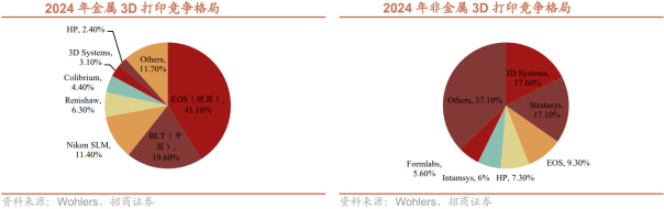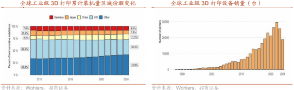 工业级3D打印的价值已超越补充传统工艺的初级阶段,正在小批量柔性生产和极端复杂结构制造两大场景中,建立起传统制造难以企及的壁垒。小批快返,实现零边际成本的敏捷制造。在航空航天、医疗器械、高端文创及科研原型等领域,产品往往具有高度定制化、小批量、快速迭代的特征。传统开模制造不仅前期投入巨大(一套模具成本可达数十万至数百万),且修改周期漫长。3D打印彻底摒弃了模具,实现了“设计即生产”。这使得企业能够以极低的试错成本快速验证产品设计、功能与市场反馈,特别适用于军工装备、医疗植入物、文创潮玩等。其核心逻辑在于,3D打印通过同一设备生产无限多样产品,实现了从“规模经济”到范围经济的跃迁,在个性化时代构建起独特的成本与效率护城河。攻克“异形件”极限,解锁材料与结构的终极性能。在追求极致性能的高端装备领域,许多关键部件因其结构极度复杂(如内流道、点阵结构、一体化拓扑优化形态等),或对材料性能有严苛要求,而成为传统减材制造工艺的禁区。航空航天:发动机燃油喷嘴内部的复杂涡流通道、钛合金轻量化舱体结构、带随形冷却流道的涡轮叶片。这些部件只能通过金属3D打印一体成型,在减轻重量的同时,实现散热效率与结构强度的倍增。精密器械:微米级孔隙的医用筛网、具有仿生结构的散热鳍片、机器人灵巧手内的复杂传动件。在这些场景中,3D打印不仅是“更优选择”,往往是“唯一解决方案”。它通过对材料性能的精确控制与对几何结构的极致释放,正在重新定义高端装备的性能天花板。全球工业级3D打印市场呈现“欧美主导、中国崛起”的竞争格局。从工业级3D打印机累计装机量区域份额来看,全球核心玩家仍以德国和美国企业为主,2024年美国仍以31%占据主导,德国以8%位居第三,值得注意的是中国从2009年的8.2%增长至2024年的11.5%。从工业级3D打印机销量来看,2024年全球销售量为18773台,同比下滑26.79%,主要系桌面级3D打印机对低端的工业级3D打印机替代。从竞争格局来看,金属3D打印中国铂力特发展迅速,高分子3D打印仍以美德为主。2024年金属3D打印市场,德国EOS以41%的市占率位居全球第一,中国铂力特市占率提升至20%位列全球第二;高分子3D打印市场美国3D Systems以17.6%位列第一,以色列Stratasys以17.1%位列第二。航空航天领域:核心刚需领域,渗透率持续提升。航空航天领域因零部件结构复杂、精度要求高、轻量化需求迫切,成为工业级3D打印的核心应用场景。航天领域,3D打印技术已成为火箭发动机等关键部件的核心生产方式。SpaceX率先将其大规模应用于龙飞船、猎鹰火箭制造,国内新研制的火箭发动机中60%以上零部件可通过3D打印生产,实现发动机组件数量减少80%,制造周期缩短70-80%,成本和重量降低40-50%,其中天鹊12B发动机3D打印零件占比达70%以上。航空领域,国际航空巨头空客、波音均大规模采用3D打印技术:空客A350XWB客机的碳纤维座椅支架通过3D打印制造,单架飞机减重超200公斤,年节省近百万欧元燃油成本。商业航天已成为核心主线:商业航天需将航天制造从任务型研制推向高频发射和批量交付,制造体系需满足快迭代、低成本、轻量化、高可靠性的核心需求,3D打印在这些维度具备核心优势。同时,商业航天要求结构件一体化以减少零件数量、焊点和装配工序,3D打印可将多零件、多焊接、多装配的长流程变为一次成型和少量后处理。商业航天对3D打印的需求主要来自两大主线:一是可重复使用火箭的高频验证迭代需求,二是卫星的批量交付需求。商业化层面,随着可复用发动机、液氧甲烷、渡线推进等进程及发射节奏加快,3D打印逐步从打样试制走向稳定批号生产,带动设备、粉末材料、后处理及检测能力系统性扩容。3D打印在航空航天及商业航天领域商业化落地的难点并非能否打印,而是批量交付,痛点在于工艺窗口和一致性(致密度、残余应力、变形控制等)、后处理体系、检测检验周期及质量回溯等方面。05