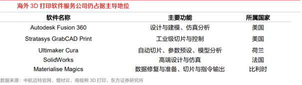 激光器为3D打印设备核心部件。以激光粉末床熔融技术为例,其核心部件包括光学系统、粉末处理系统、成型系统、控制系统、气体保护系统,而光学系统中的激光器和扫描振镜至关重要。对于数字光处理(Digital Light Processing,DLP)技术而言,光源、DLP芯片、控制系统、打印平台、光敏树脂等为其核心部件。总体而言,热源和控制为核心技术和核心部件,热源包括激光束、电子束、微束等。激光束已经成为金属3D打印最主流的热源。相对于电子束、微束等离子,激光束具有光斑细、成本低、可定向作用到指定材料位置等优点。常见的3D打印激光器包括CO2激光器、YAG激光器以及光纤激光器,其中CO2激光器为早期光源,但是金属的吸收率低。YAG激光与金属的耦合效率高、加工性能良好。总体而言,打印聚合物以CO2激光器为主,而金属粉末的3D打印主要使用光纤激光器。相关公司包括IPG、锐科激光、大族激光、创鑫激光、杰普特等。激光振镜是一种基于电磁驱动的高速精密光学偏转器件,通过控制电流驱动反射镜片快速偏转,从而实现对激光束方向的精确控制。激光振镜可用于光通信、医疗设备、机器视觉等领域。结构上看,振镜头主要元件为X/Y两个反射镜片、分别控制X/Y镜片旋转的两个电机,根据实际需求还可加入人机操作系统、编码器等。按照驱动方式分为动圈式振镜、动磁式振镜;按运动维度可以分为一维振镜、二维振镜、三维振镜;按反馈控制方式可以分为开环振镜、闭环振镜。激光加工为主要下游,海外企业占据高端市场。根据智研咨询数据,2024年我国激光振镜市场规模约17.9亿元,激光加工领域应用占比84.5%。格局角度看,国外企业占据高端市场,包括美国CTI、德国Scanlab和Raylase等,国内企业包括金橙子、大族激光、金海创、菲镭泰克、正时精控等。3D打印软件供应商呈现综合发展态势,在不断提升核心CAD软件技术性能的同时,开发更多集CAD、CAE、CAM等辅助软件于一体的综合软件。目前CAD软件技术主要厂商为达索系统,西门子,欧特克,PTC和中国中望等。06