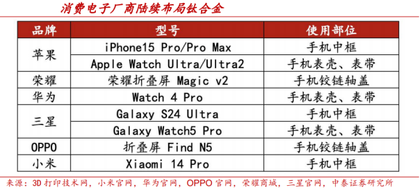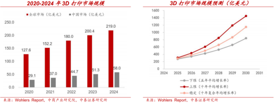 金属粉末价格持续下行,成本优化空间显著释放。3D打印要实现规模化应用,成本控制是核心前提。金属粉末作为主要原材料,其价格走势直接影响整机制造成本。以国内厂商铂力特为例,2020–2022年其自制钛合金3D打印粉末销售价格已从144.5万元/吨下降至78.2万元/吨,三年内累计降幅高达46%。在粉末球形度、密度、流动性等关键性能指标对标国际领先标准的基础上,价格下降进一步提升了国产材料的性价比优势。未来随着国产粉末产能释放和工艺稳定性提升,金属粉末价格仍具备进一步下探的空间,成为推动金属3D打印成本结构优化的关键变量,为工业场景广泛落地奠定基础。主流工艺路径技术成熟,产业化基础加速形成。金属3D打印技术逐步迈入成熟阶段,已具备支撑规模生产的工艺体系。主流路径包括粉末床熔融(PBF)和定向能量沉积(DED)两大类。其中,PBF工艺下涵盖SLM、SLS、EBM、MJF等子技术,适用于制造高精度复杂零件;而DED工艺(如LSF、WAAM)则适配大型结构件与修复场景。根据Wohlers2022年联合Senvol数据库统计,在全球范围内已有94%的金属增材制造产品采用PBF或DED技术,显示其已实现从实验验证到工业量产的关键跨越。PBF与DED路径在工业成熟度与应用广度上的同步提升,意味着金属3D打印已从“能不能用”转向“稳定可用”,为行业进一步拓展提供工艺保障和产业化基础。全球3D打印市场稳步扩张,2030年有望达1150亿美元。过去五年,全球3D打印行业整体延续增长趋势,市场规模由2020年的127.6亿美元增至2024年的219亿美元,CAGR达14.46%,保持稳定扩张。同期中国市场表现尤为亮眼,市场规模由2020年的208亿元人民币增至2024年的415亿元,CAGR达18.85%,成为全球增长最为迅速的地区之一。根据Wohlers预测,2030年全球3D打印市场规模将取决于未来增长路径:在成熟稳步增长情形下预计为840亿美元,高速增长情形下可达1450亿美元;若按十年CAGR(18%)推算,市场规模约为1150亿美元。航天航空需求相对稳定,复杂轻量化部件成标配。在2022年中国3D打印应用领域中,航空航天以16.72%的占比居首。金属增材制造技术凭借高强度、高精度和材料利用率高的优势,适用于一体化、多样化和异型构件的定制与快速迭代生产,在零件减重的同时,相比传统方式缩短生产周期并降低成本。航空航天领域已将3D打印确立为制造轻量化与复杂几何部件的核心手段。据Mordor Intelligence的预测,全球航空航天及国防领域的3D打印市场将于2029年达到82亿美元,预测2024年-2029年复合增长率为约15.1%。消费电子空间广阔,新兴市场需求涌现。中国消费电子市场自2018年起呈增长趋势,2024年规模近1.98万亿元。消费电子产品正朝着减重、减薄与高复杂度方向演进,加之品牌在ESG和成本优化上的诉求,促使3D打印技术高度适配该领域。尤其在折叠屏铰链、手表及手机中框等3C领域精密零部件中,3D打印表现尤为突出。在设备开发中,3D打印大幅缩短原型验证周期,降低试错成本,并推动结构创新。随着设备和材料成本下降,3D打印将在更多消费电子产品中落地。3D打印助力汽车制造。据Precedence Research预测,2024年全球汽车3D打印市场规模约为33.6亿美元,预计至2034年将超过256.1亿美元,2025-2034年间复合增长率(CAGR)达22.52%,同时亚太地区增速最快。增长动力源于对轻量化、可定制零部件和制造可持续性的多重需求。3D打印技术为汽车制造商提供了极具价值的新路径:设计更新后可直接打印原型,加快设计迭代、降低成本;能制造气缸盖、液冷换热器、发动机缸体等功能件;还能通过集成模具与型芯、特定索具几何结构,实施高复杂度铸造以提升稳定性、缩短准备时间。该技术彻底变革了开发、设计与制造流程,实现更安全、成本更优、研发周期更短的产品开发流程。医疗器械定制升级,3D打印驱动精准医疗发展。3D打印技术显著提升了医疗器械领域的定制化制造能力,包括假体、植入物、手术导板、微型器械以及人体器官模型等应用。目前,已被应用于制造全膝关节植入物、髋臼杯、脊柱植入物等,为骨科、口腔科提供高度定制、精度可控的解决方案,制备复杂且高度定制化的高价值小型产品,并为手术规划提供精确模型,降低了手术风险,使得个性化医疗和精准治疗成为可能,推动行业进一步走向高端化与专业化。瞄准人型机器人轻量化需求,3D打印有望打开市场空间。目前已有多款机器人使用3D打印技术部件,相较于传统工艺,3D打印技术在材料性能、一体成型和生产效率方面展现出显著优势:3D打印件在Z轴方向上拥有卓越的强度,具有各向同性,并且在重量上可实现零部件减重超80%,让机器人动作更敏捷、能耗更低;通过3D打印可实现复杂内部结构与多尺度构型设计,实现复杂结构的无支撑一体成型,满足个性化定制需求;3D打印支持从数字模型到实体部件的直接转换,无需模具开发,大幅缩短研发周期,加速产品迭代,未来有望进一步推动人形机器人的升级迭代。数据中心液冷需求爆发式增长,3D打印散热器需求广阔。据Mordor Intelligence报道,2024年全球数据中心液冷市场空间为47.7亿美元,2024至2029年间CAGR为25.44%,预计2029年将增长至148.1亿美元。由于服务器机架平均功率密度高,AI算力提升带来的散热挑战。据麦肯锡称,平均功率密度从2022年的8千瓦增加一倍多,达到2024年的17千瓦,预计到2027年将达30千瓦。像OpenAI的ChatGPT这种训练模型,每个机架可能需要超过80