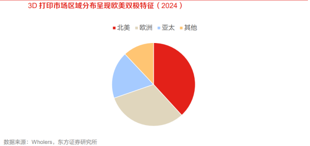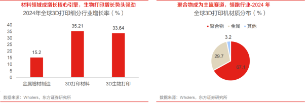 全球3D打印市场已初具规模。2024年全球3D打印市场(工业级 消费级,含3D打印设备、3D打印材料、3D打印制成品)规模达219亿美元,同比 9.31%,行业已从小众技术应用迈入规模化扩张阶段。从收入构成来看,打印服务(即销售3D打印制成品)收入占据半壁江山(46%)。消费级3D打印设备方面,2024年全球消费级3D打印机保有量已达1500万台量级。美国为第一3D打印市场,亚太市场增长更为迅速。2020年美国3D打印产业规模占全球比重34.4%,中国为10.8%。2024年全球3D打印细分行业增长率整体较高,其中3D打印材料居于首位( 35.21%),3D生物打印紧随其后( 33.64%),金属增材制造增速也达到15.2%。2024年全球量产3D打印机主要分为非金属(聚合物)打印机和金属打印机,分别占67.1%和29.7%。中国成为全球3D打印相对更具潜力市场。2015-2017年产业规模年均增速超30%,2024年达423亿元,近五年持续增长,产业发展进入规模化放量阶段,商业化落地成效显著。从产品结构来看,2024年打印设备和打印服务的营收占比较高,合计占比达76%。中国3D打印设备产量持续扩容,以出口为主。从出口端看,我国3D打印机呈现“量稳增、利提速”的特征,且市场聚焦北美地区,出口逻辑也同步从“以量为先”转向“以质补量”。国内市场超300亿,行业保持高速增长。2023年我国3D打印市场规模为367亿元,2019~2023年平均增速约25%,行业还处于成长趋势之中。下游来看,航空航天、消费电子、鞋模等行业正在加速使用3D打印技术,预计行业未来仍然可以保持较好的增长。美国企业在非金属打印领域布局较多,欧洲更多在金属材料领域,国内企业多点突破。2017年全球前三大专业级3D打印公司均为非金属3D打印为主。2020年,我国3D打印设备市场,联泰市占率16.4%,Stratasys市占率14.8%,EOS市占率13.1%,GE市占率9.8%,3DSystems市占率8.2%,华曙高科市占率6.6%,铂力特市占率4.9%。国内来看,联泰科技、华曙高科、铂力特等企业在工业级打印占据一定市场,创想三维、拓竹科技、智能派等企业在消费级领域表现出色。03