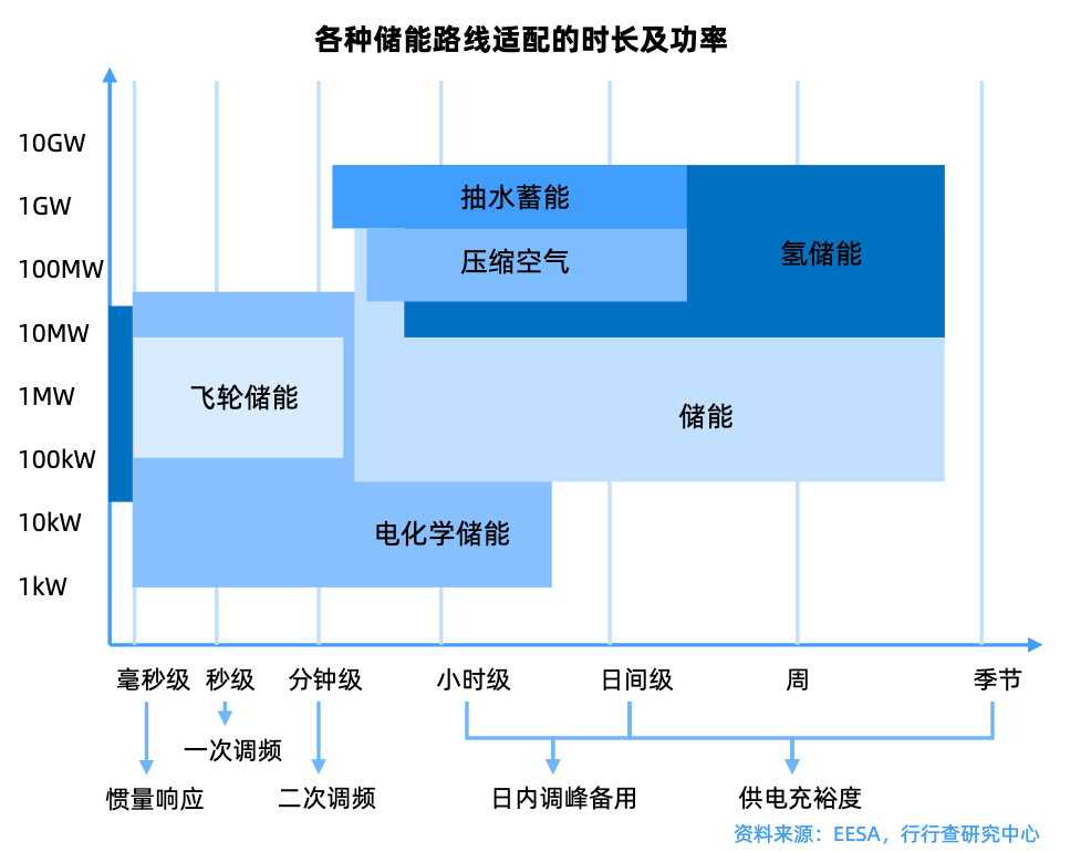 各储能技术的系统额定功率与放电时间:
