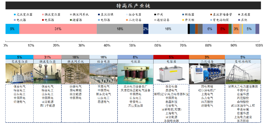 特高压产业链涉及电力设备的品类较多,其中按照招标价值量金额来看,换流变压器、换流阀系统、组合电器、电抗器、交流变压器、变电站架构、电容器占比分别为31%、18%、16%、6%、5%、5%、5%,合计占比达到85%。