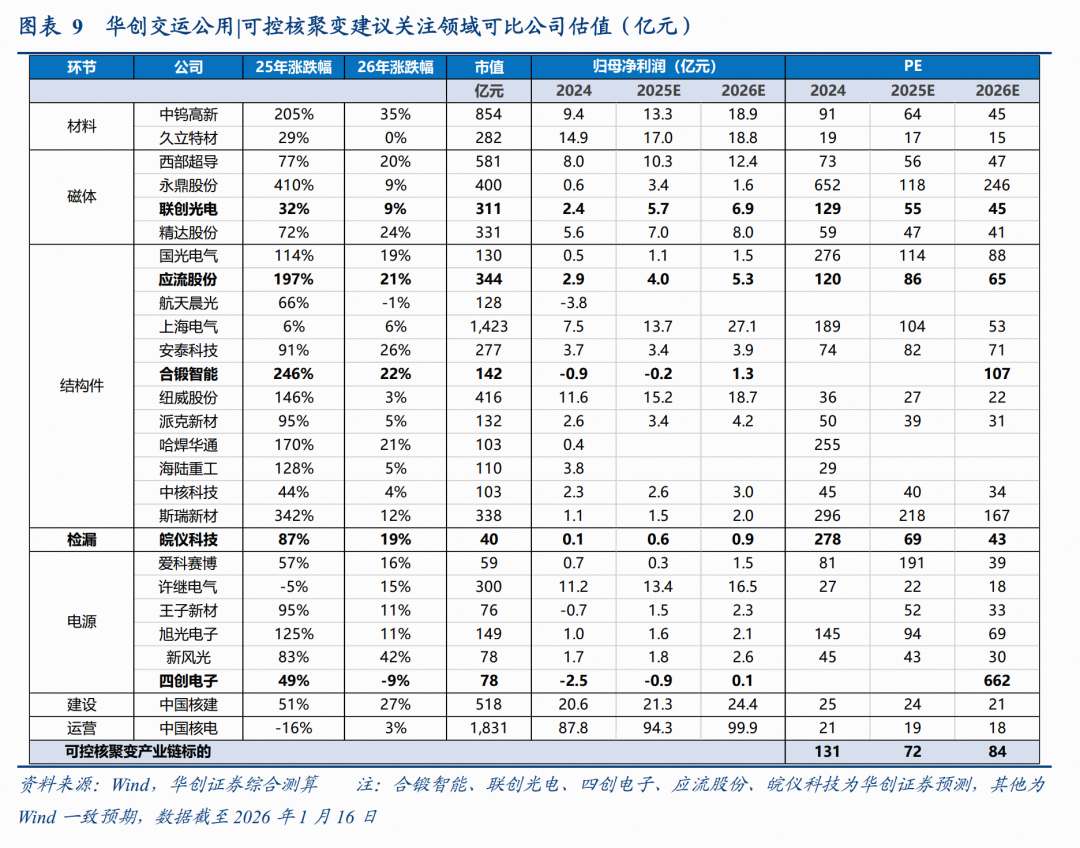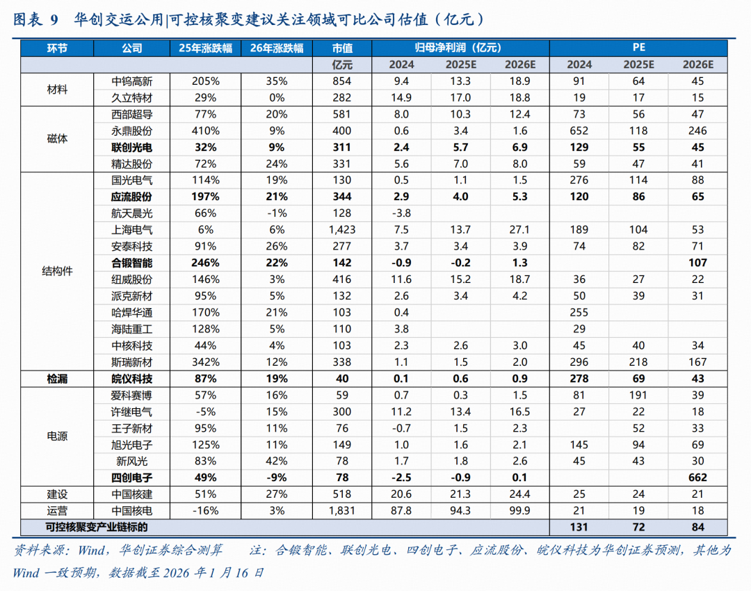 根据我们统计的招标数据,2025年11月,中科院合肥等离子体物理研究所及聚变新能安徽的招标项目显著放量,仅11月招标金额就达到39亿量级,而2025Q1、2025Q2、2025Q3的招标金额分别仅为4.48、4.40、8.72亿元,11月单月招标金额已显著超过前三季度招标金额的总和。2026年1月以来,招标总额约为1.28亿元。