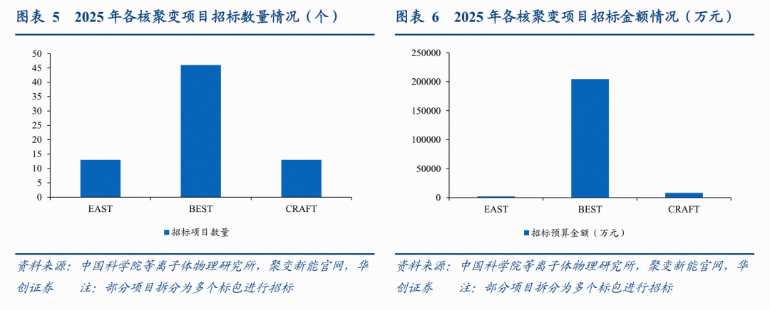 2025年初以来,根据我们统计的招标数据,2025年1月1日至2026年1月16日,BEST项目招标数量达到46个,招标预算金额达到20.44亿元,同期EAST、CRAFT项目的招标数据量仅为13、13个,招标预算金额分别为0.22、0.82亿元。其中,EAST项目多为升级维护,而BEST则涉及多个关键部件(磁体线圈、偏滤器、包层系统及第一壁)的招标,高价值量订单密集落地,表明行业或已逐步从密集招标步入密集中标的阶段,资本开支扩张逻辑持续验证。