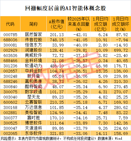 今年年初,AI智能体概念热度爆棚,诞生多只牛股,近期随着热度降温,不少概念股已出现明显回撤。据证券时报·数据宝统计,截至1月19日收盘,最新收盘价较2025年以来高点回撤20%以上的AI智能体概念股有84只。居然智家、传音控股、恒信东方、润建股份、南威软件等回撤幅度靠前。