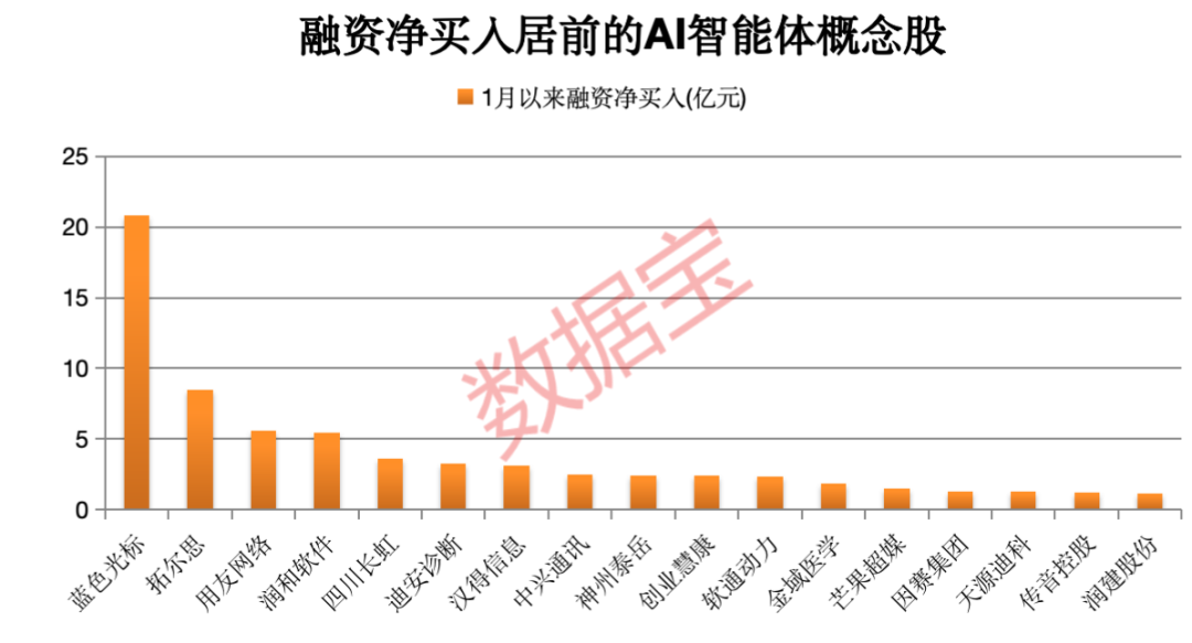 资金流向方面,截至1月19日收盘,上述回撤20%以上的AI智能体概念股中,1月以来获得融资净买入超1亿元的有17只,如蓝色光标、拓尔思、用友网络、润和软件、四川长虹等。