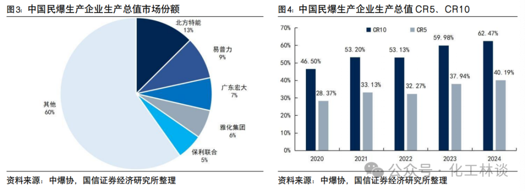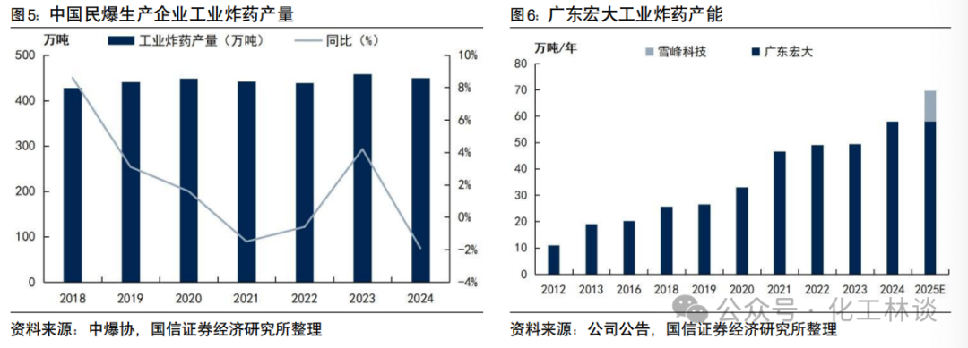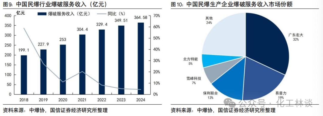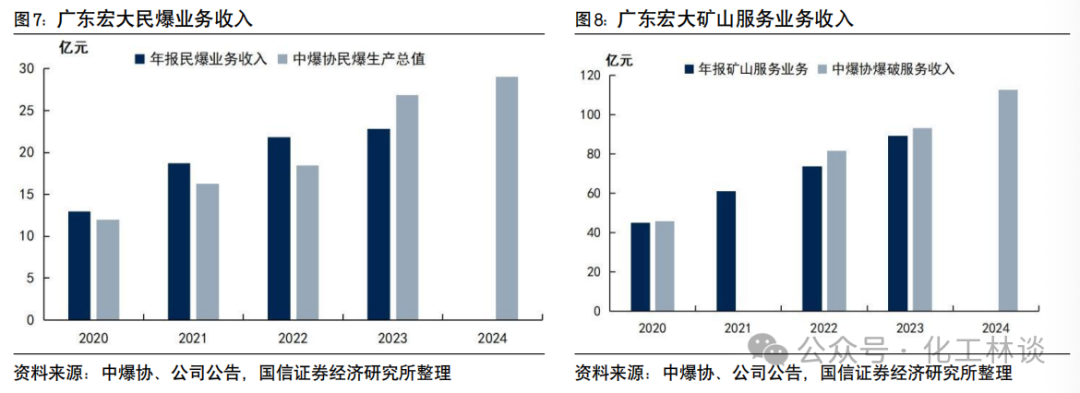 民爆行业集中度继续提升,公司市场份额持续扩大。2024年民爆行业集中度继续提升,行业CR5、CR10分别达40.19%、62.47%,分别较2023年提升2.25%、2.49%。据中爆协,2024年广东宏大实现民爆生产总值29.05亿元,同比增长8.11%,排名国内第三,市场占比6.97%,较2023年提升0.81 pcts,市场份额持续扩大。