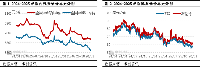 2025国内汽柴油价格重心下跌,期间阶段性反弹,但受供求关系利空驱动,汽柴油批发价格下滑为主,且刷新近两年最低点。原油成本下行仍是导致汽柴油价格下跌主要驱动因素,价格向下传导仍然较强,叠加替代资源规模不断扩大,以及成品油需求疲软等因素拖累,多重利空因素共振下跌,今年汽柴油市场表现低迷,行业竞争以及内卷压力较大。