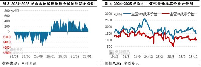 国际原油成本下跌,炼油裂解成本随之下降,但下游综合产品收入降幅不及原油成本波动,通过对油价传导分析看,山东地炼综合炼油理论利润修复性改善。据卓创数据统计,2025年山东地炼综合炼油利润持续处于正值波动区间,相比2024年呈现出差异化表现。但由于主要裂解产品汽柴油产品收入下滑为主,炼油利润仍处于偏低位运行阶段,行业利润率仍然偏低。2025年山东地炼综合炼油利润年度均值在260.1元/吨,折算平均炼油利润率在4.15%,受到加工成本以及采购成本的影响,独立炼厂综合毛利表现仍然不高。