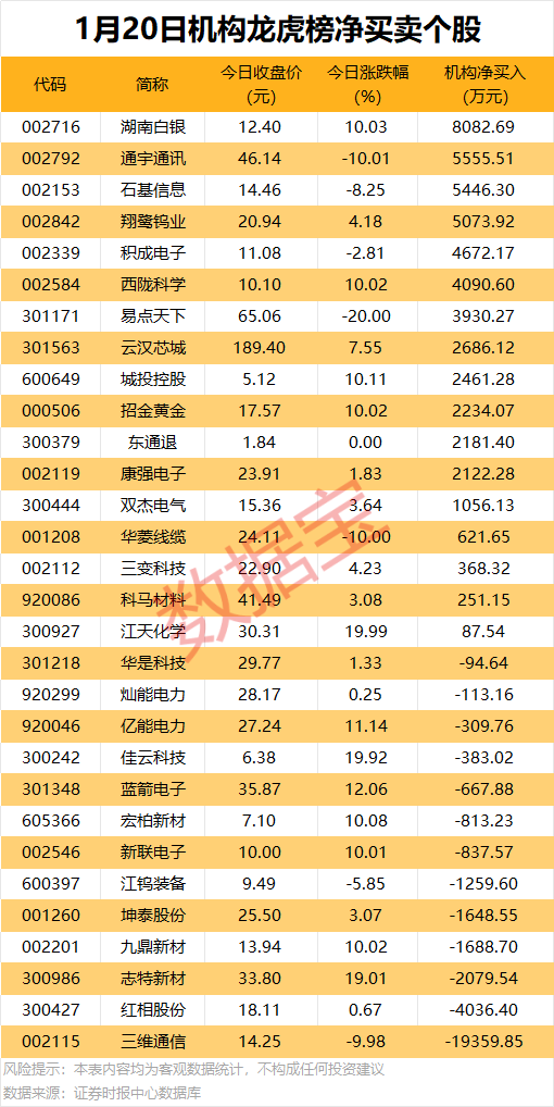 今日龙虎榜中,净买入个股有17只,净卖出的个股为13只。13股净买入金额均超千万元,湖南白银获机构净买入8082.69万元,居首;其次是通宇通讯,机构净买入金额为5555.51万元。