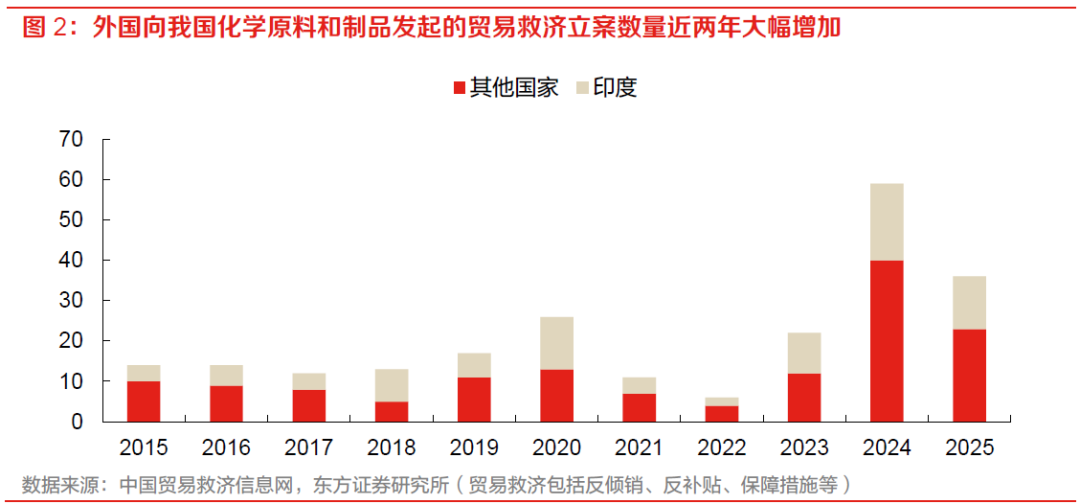 第二从外部看,我国大宗化工的产业扩张已开始触及规模边界。化工行业受到原料与产品运输经济性的影响,天然具有明显的规模边界。不过随着近几年我国化工产业水平突飞猛进,加工环节成本不断压缩,扩张了经济性的规模边界。但是过强的成本竞争力也导致来自于贸易保护的边界,我们在前期的深度报告《反倾销事件频发下的化工行业机会》中就对此进行过分析。从外国对我国化学原料与制品业发起的各种贸易保护类调查可以看出,扣除实际影响较小的由印度发起的案件,每年正常立案数在10件左右,而2024年暴增至40件。大幅增加的贸易争端也让企业认知到以往靠提升份额来消化产能扩张的难度越来越大。