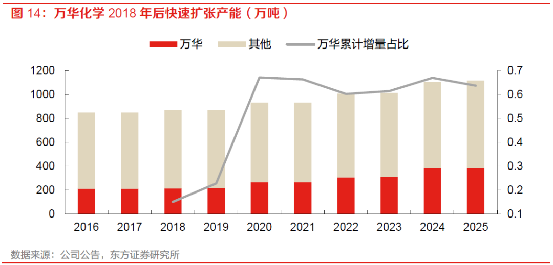 行业龙头优势越大,与边际成本的差距越大。在行业增速放缓,竞争对手扩张意愿减弱的情况下,行业龙头只要预留一部分产能,就能够持续保持对于竞争对手的约束。此时,如果龙头从份额导向转向盈利导向,那价格弹性就非常明显。我们还是以MDI为例,上一轮景气周期2021-2022年时,主动提出新建绿地项目的只有科思创(之后宣布放弃)。然而,科思创如今已经被阿布扎比国家石油(ADNOC)收购,并更换了监事会主席,ADNOC与万华化学又早就结为战略合作伙伴。如果MDI景气度回到2021-2022年水平,行业还能保持有序发展,那这对于万华就意味着显著的盈利弹性和长周期的景气度。2021年相比2025年MDI单吨价差高约3000元,如果价差回到21年水平,那万华的年化盈利可以提升约80亿元。