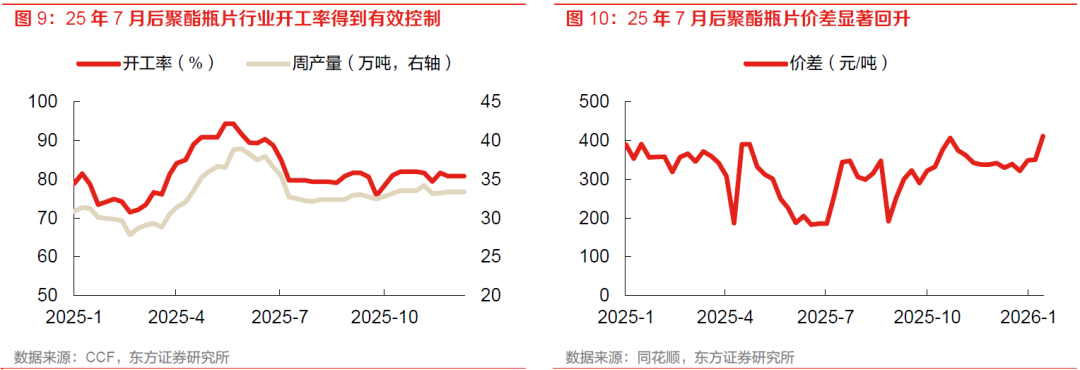从近期变化来看,国内已有个别化工子行业通过类似方式实现了回报率修复,如聚酯瓶片、己内酰胺、有机硅等。聚酯瓶片行业的龙头公司在25年6月底推出了减产计划,我们在当时的深度报告《聚酯瓶片行业有望提前复苏》中分析了行业情况,认为减产计划有望成功,并使瓶片行业盈利实现快速的修复。从之后的实际情况看,7月以来行业开工率得到有效控制,产量从6月最高时每周约39万吨降低到约33万吨,相当于年化产量减少了约290万吨,价差也实现了明显回升。