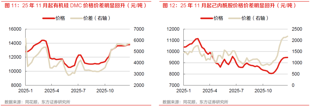 从有机硅和己内酰胺的情况看,两个行业都在25年11月初几乎同时出现了价格和价差的明显回升。据百川盈孚报道,主要的上涨动力就是两个行业都形成了联合减产挺价方案。有意思的是,有机硅行业在25年一季度就开展过行业自律性的减产挺价,但结果并不成功,很快就因企业库存累积开始降价去库。而11月能够取得成功,主要是由于山东主要供应商在合适的时机,出人意料地带头上调价格。可见龙头企业的经营策略转变对于行业盈利能力有着举足轻重的作用。
