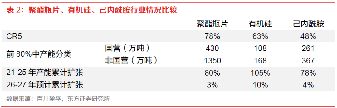 从这三个行业的客观数据比较来看,都有一个共同点,即过去几年都经历过大规模产能扩张,而未来两年产能增速很低。大量过剩产能导致的恶劣现实,再叠加扩产约束不断收紧的未来预期,为企业调整经营策略打下了重要基础。从集中度看,三个行业又各不相同。其中聚酯瓶片CR5高达78%,而己内酰胺CR5只有48%。聚酯瓶片在集中度较高的情况下,龙头企业之间竞争力存在较大差异。己内酰胺与有机硅行业中主要企业属于国营的比例明显高于聚酯瓶片。