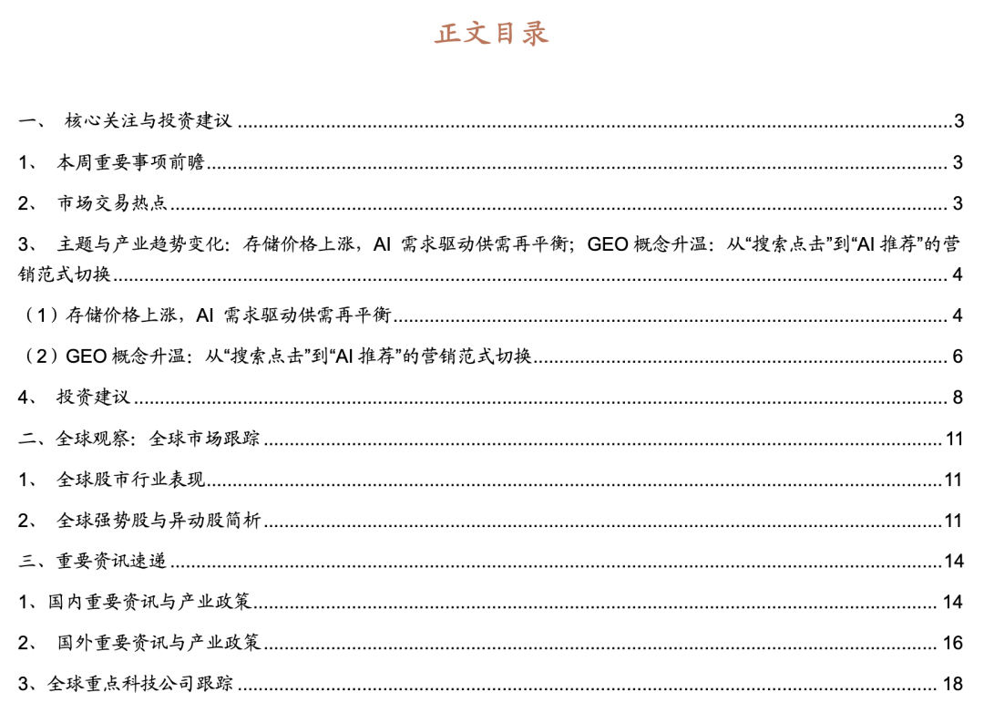 3、主题与产业趋势变化:存储价格上涨,AI 需求驱动供需再平衡;GEO概念升温:从“搜索点击”到“AI推荐”的营销范式切换
