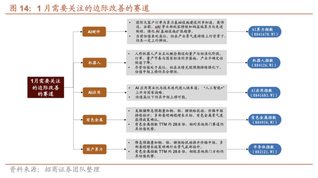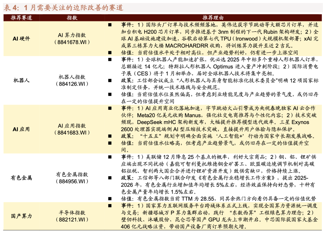 1月重点关注五大具备边际改善的赛道:AI硬件、机器人、AI应用、有色金属、国产算力。