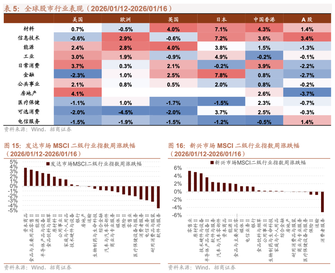 上周全球股市涨跌互现,其中材料、信息技术、能源表现较好,电信服务、可选消费、医疗保健表现一般。具体来看,美股涨跌参半,房地产、日常消费、工业表现较好,金融、可选消费、电信服务表现一般;欧股涨多跌少,信息技术、能源、工业表现较好,可选消费、电信服务、材料表现一般;英国股市涨跌参半,材料、能源、金融表现较好,可选消费、医疗保健、电信服务表现一般;日本涨多跌少,金融、信息技术、材料表现较好,医疗保健、电信服务、日常消费表现一般;港股涨多跌少,材料、日常消费、信息技术表现较好,电信服务、工业表现一般;A股涨少跌多,信息技术、材料、电信服务表现较好,房地产、金融、日常消费表现一般。
