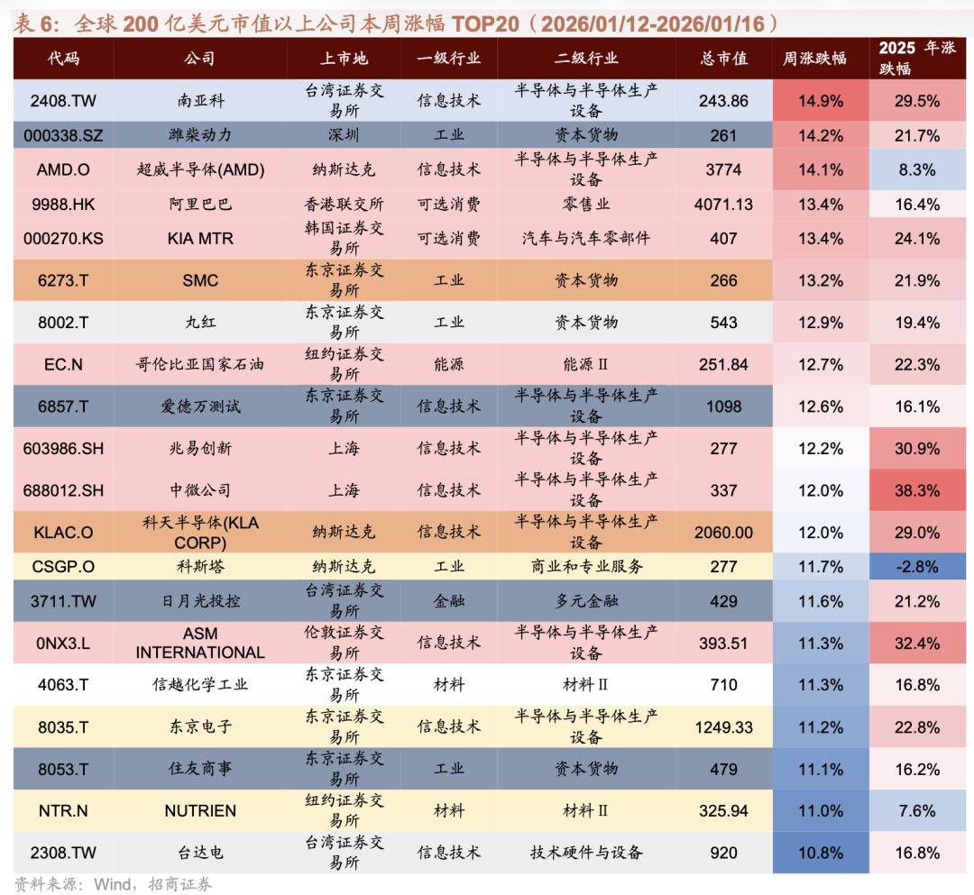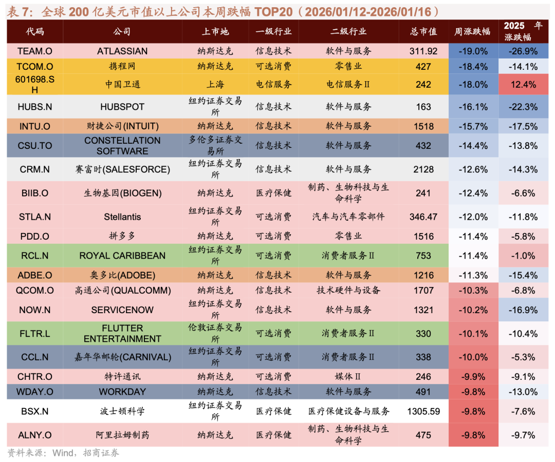 过去一周领涨的200亿美元以上市值公司中,信息技术和工业居多;过去一周领跌的200亿美元以上市值公司中,信息技术和可选消费居多。