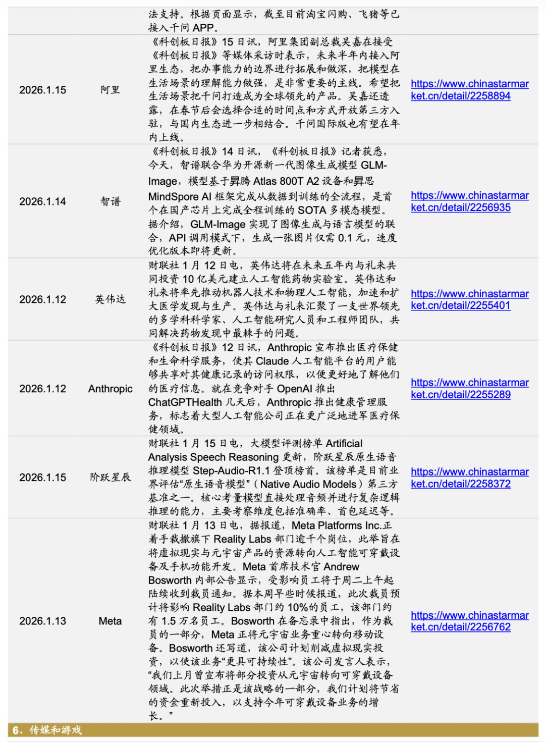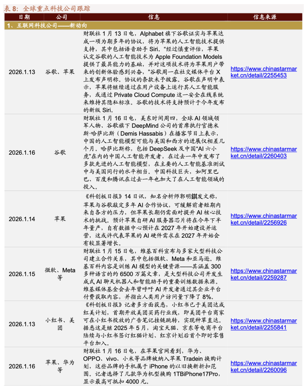 【重要资讯】人工智能:近日,工业和信息化部、中央网信办、国家发展改革委、教育部、商务部、国务院国资委、市场监管总局、国家数据局等八部门联合印发《“人工智能 制造”专项行动实施意见》(以下简称《意见》)。人工智能:本周,苹果宣布与谷歌达成协议,使用Gemini模型为苹果的人工智能提供支持,并改进Siri语音助手。苹果未来可能将向谷歌支付数十亿美元。这对OpenAI来说可能是一个重大挫折。2024年以来,OpenAI一直筹谋将ChatGPT集成到苹果的生态系统之中。一周前,OpenAI宣布推出ChatGPT Health功能,将与苹果的健康功能集成,用户可同步睡眠、步数等数据。